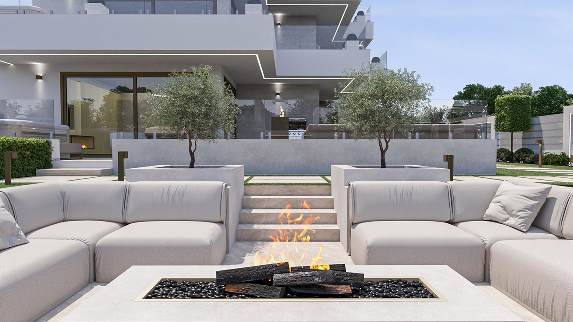 A modern nappali – étkező tér a kandallóval, a hozzá bárral kapcsolódó konyhával és az üvegfalak tolóajtóival egybenyitható nagyméretű terasszal, különleges atmoszférát nyújt tökéletes helyszínt biztosítva  a közös pihenésnek, étkezéseknek, kikapcsolódásnak és a meghitt pillanatoknak.