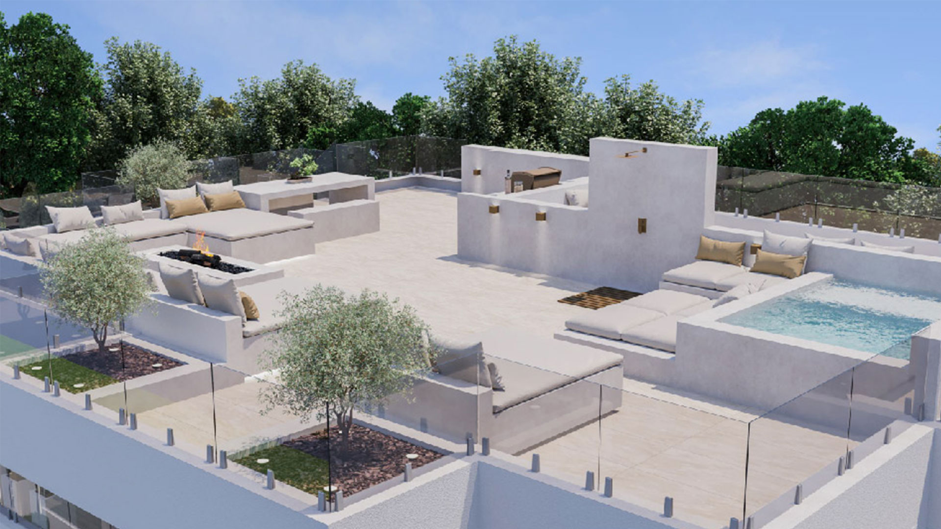 Ez a Nappali + 2 szobás egyedülálló adottságokkal rendelkező nagyteraszos luxus lakás privát pihenő tetőkerttel – kiváló térkapcsolatokkal rendelkezik. A lakás lakóterei kinyúlnak a lakást délkelettől délnyugatig körbe ölelő nagyméretű teraszra, ahonnan gyönyörű panoráma tárul az épület egyedülálló lakókertjére, tökéletes harmóniába vezetve át a beltéri lakófunkciókat a lakáshoz szervesen kapcsolódó külső terekbe.